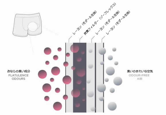 多孔質素材であるため、おならの吸収と消臭に効果的です。また洗濯することで素材の消臭性能を回復させることが可能です。