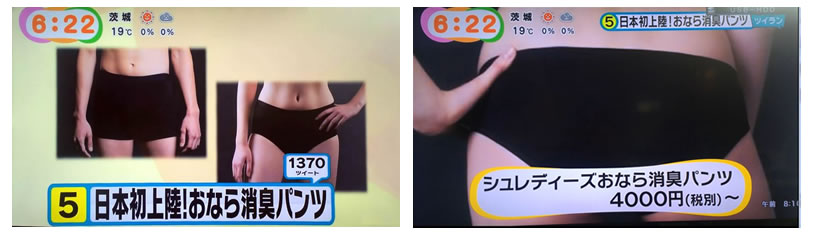 【めざましテレビ|フジテレビ】の「今話題のツイートランキング」のコーナーで弊社の販売するシュレディーズおなら消臭ショーツが紹介されました。